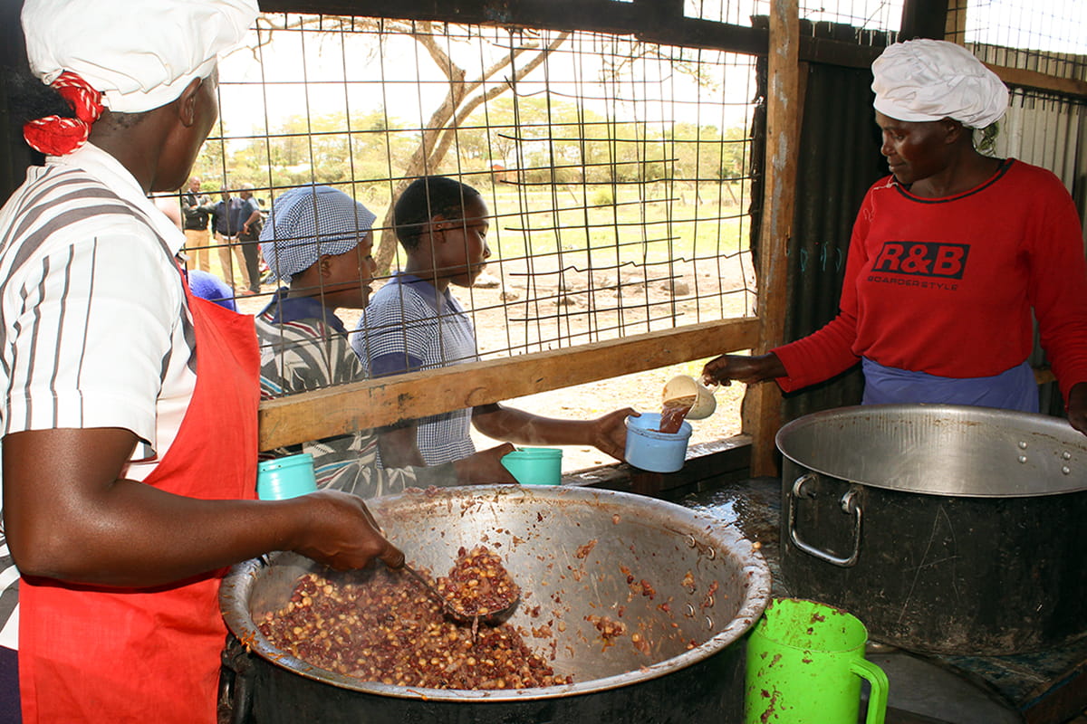 Students at the Juja Farm primary school in Nairobi Kenya are served lunch. The school’s kitchen was recently renovated with funds from Unbound’s Agents of Change initiative.