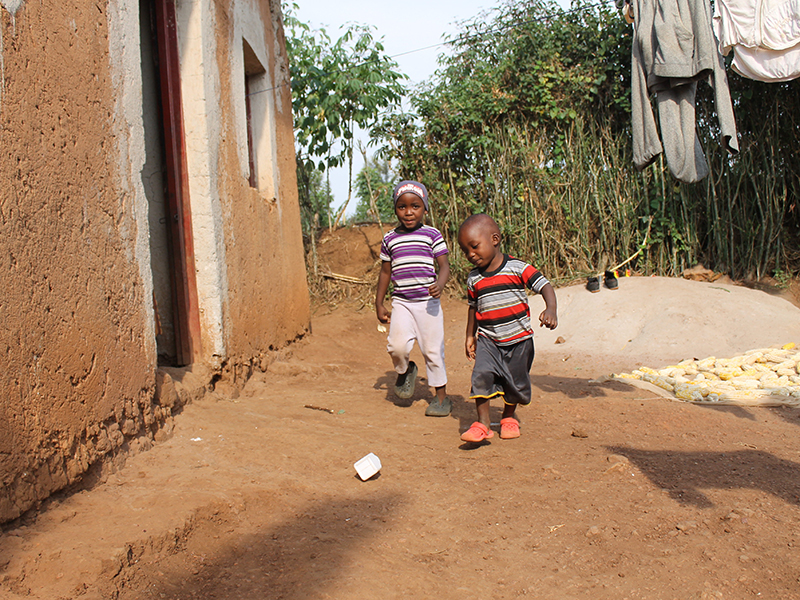 Photo 1: Sponsored child Kevin, 5, and his little brother Irumia, play outside their home in Rwanda.