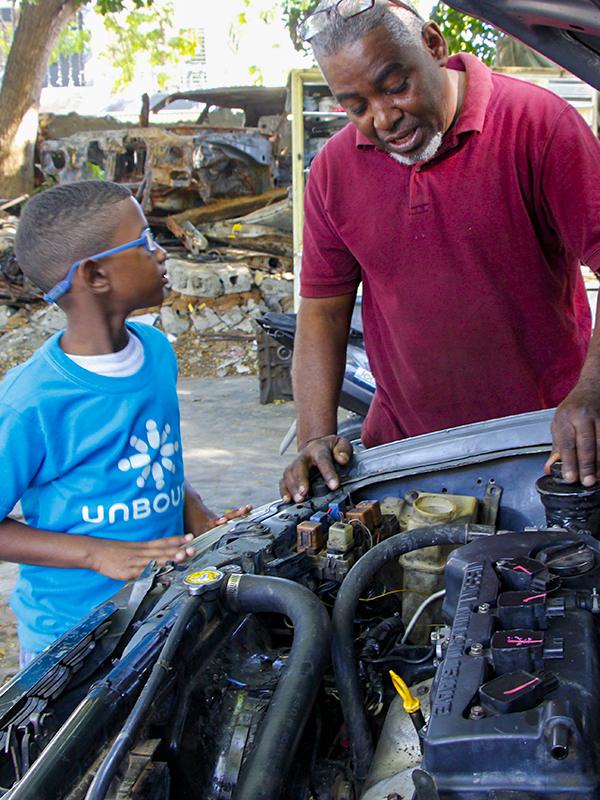 (Upper left) Sponsored child Misael, 10, lives in the Dominican Republic. His father, Sergio, is a mechanic and wants to teach his son the trade but worries that the boy’s visual impairment might make it difficult for him. (Upper right) Motor bikes are a popular form of transportation on the rough roads and congested streets of Kenya. Some riders carry amazingly large loads on the backs of the bikes.
