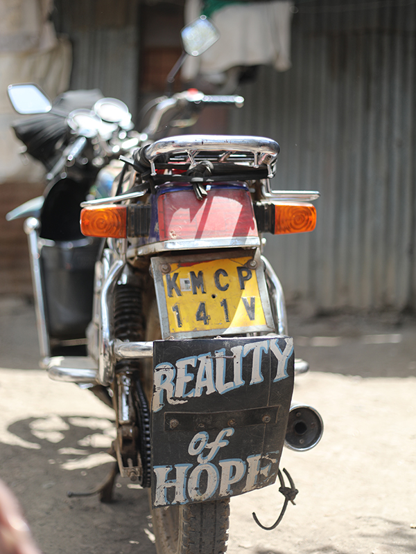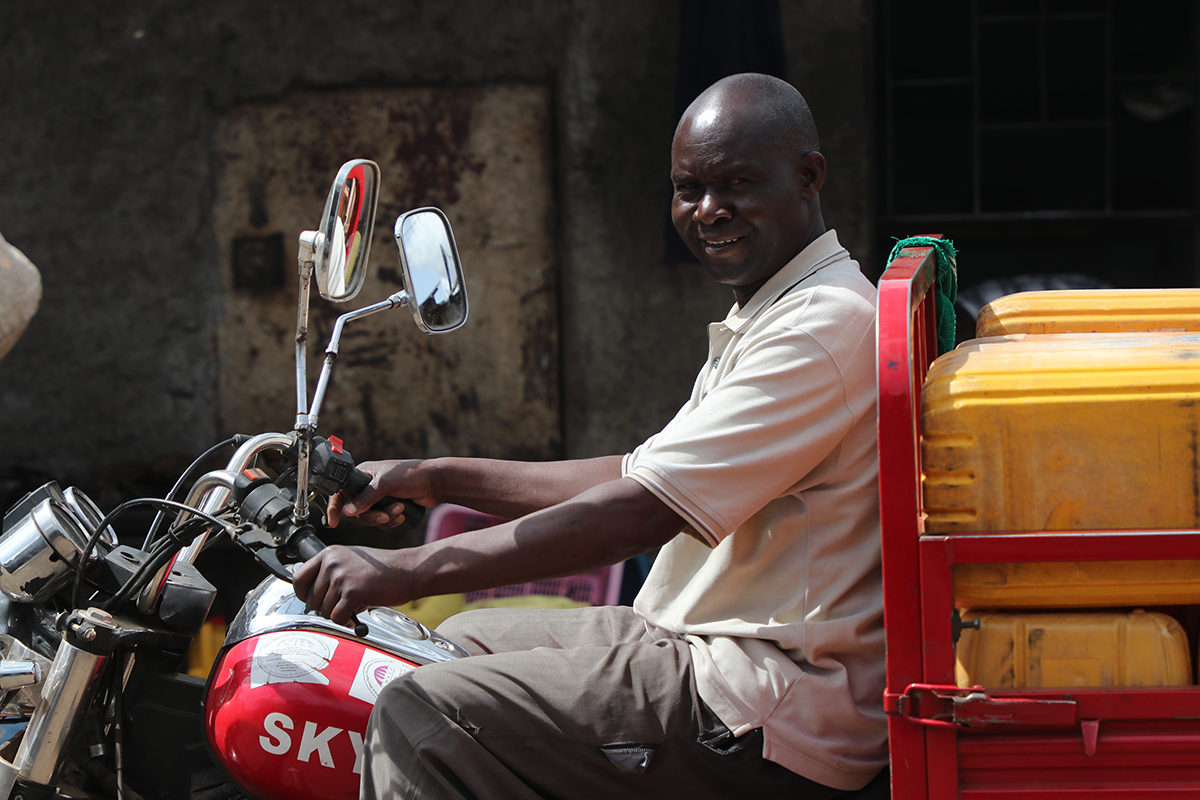 (Bottom) Tobia drives his motorbike throughout the sprawling Kibera slum in Nairobi, Kenya, selling drinking water to residents. He is the father of sponsored youth Maurice.