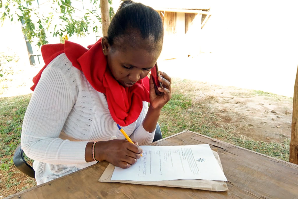 Photo 2: Purity Wanja, a staff member in Unbound’s Meru program in Kenya, records a parent’s responses for an evaluation gauging families’ awareness of child protection policies.