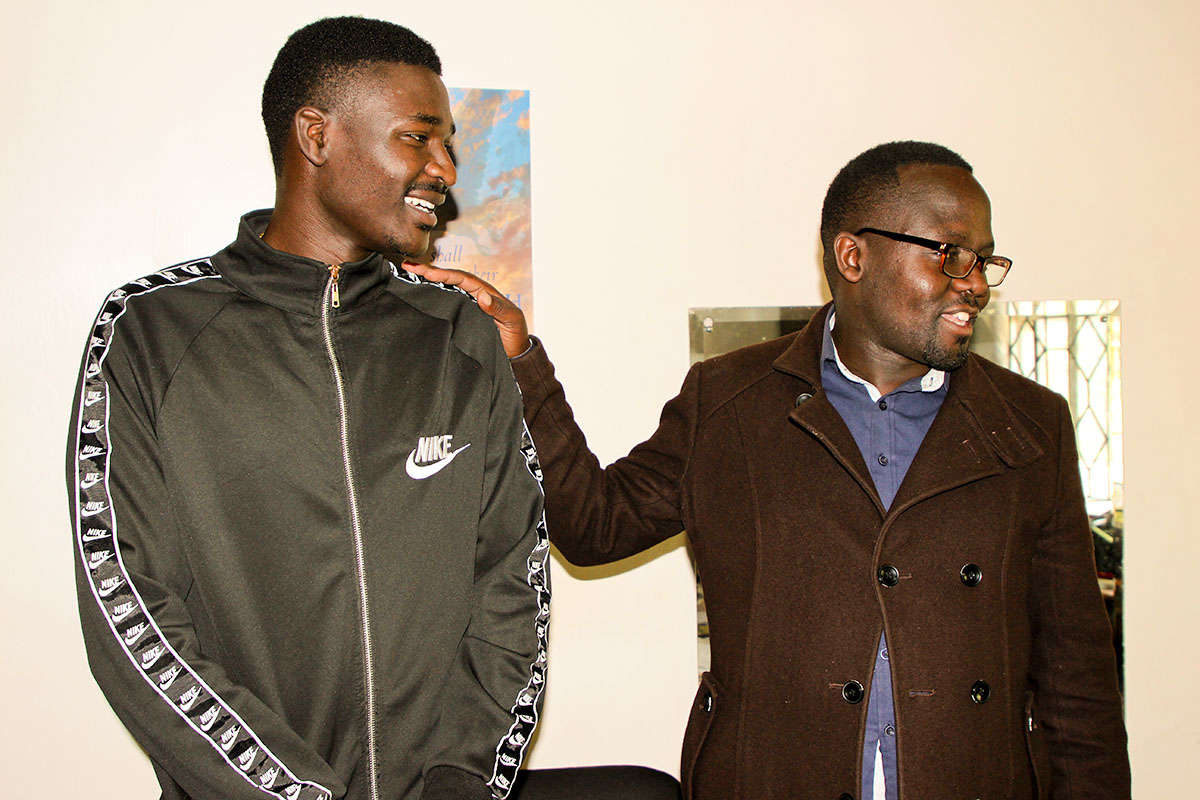 Photo 1: Staff member Amos Kihoro (right) congratulates Unbound scholar Michael on his educational successes. Amos coordinates the scholarship program and Unbound Awareness Trips in Nairobi, Kenya.