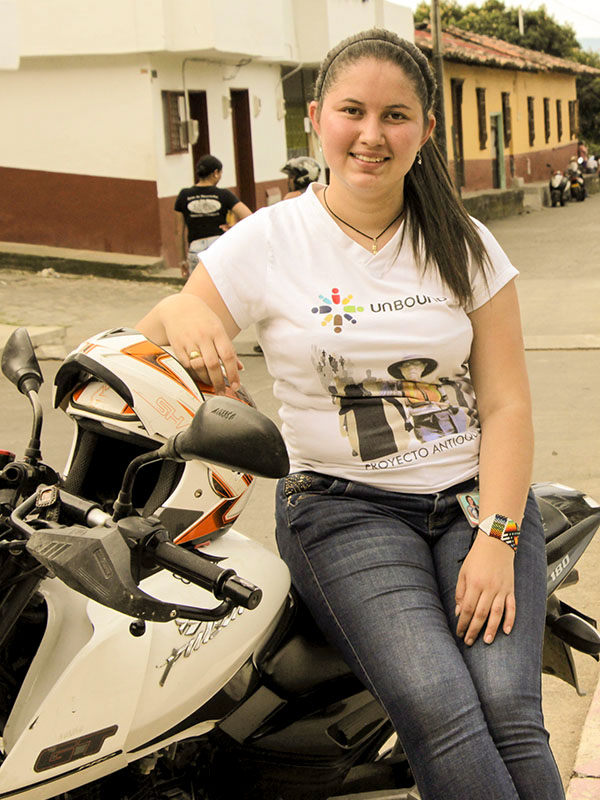 Photo 2: Yenifer Tatiana Valencia Morales, an Unbound social worker and former sponsored member, is seen here with the motorcycle she uses to zip around neighborhoods in Medellin, Colombia. Yenifer was featured in Pope Francis’ book, “Sharing the Wisdom of Time.”