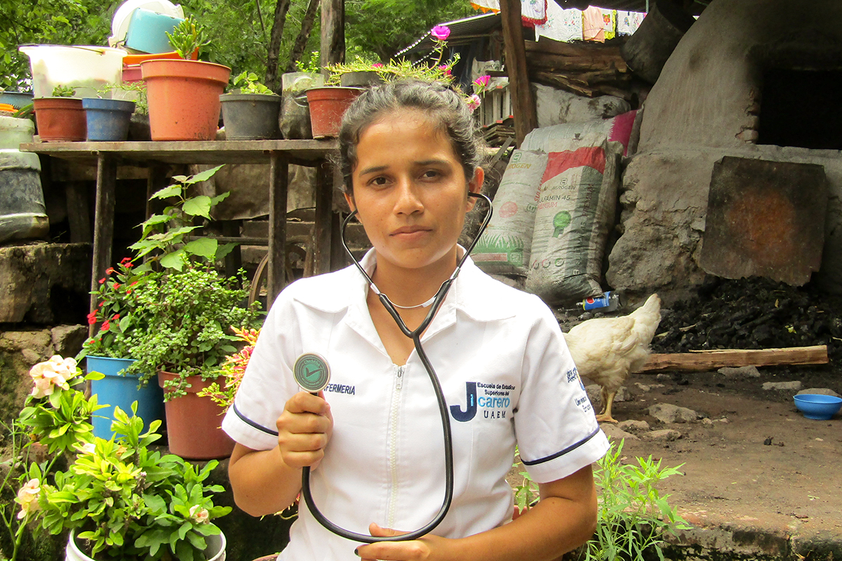 Like the young woman featured in the story, many young people in the Unbound program aspire to careers in the medical profession, often with hopes of returning to serve their local communities. The four pictured here are in various stages of nursing training. Clockwise from top left are Yessica from Guatemala, Pinky from India, Naomi from Chile and Pablo from Guatemala. The three young women are scholarship recipients and Pablo is receiving continued support from his sponsor, who is also a nurse.