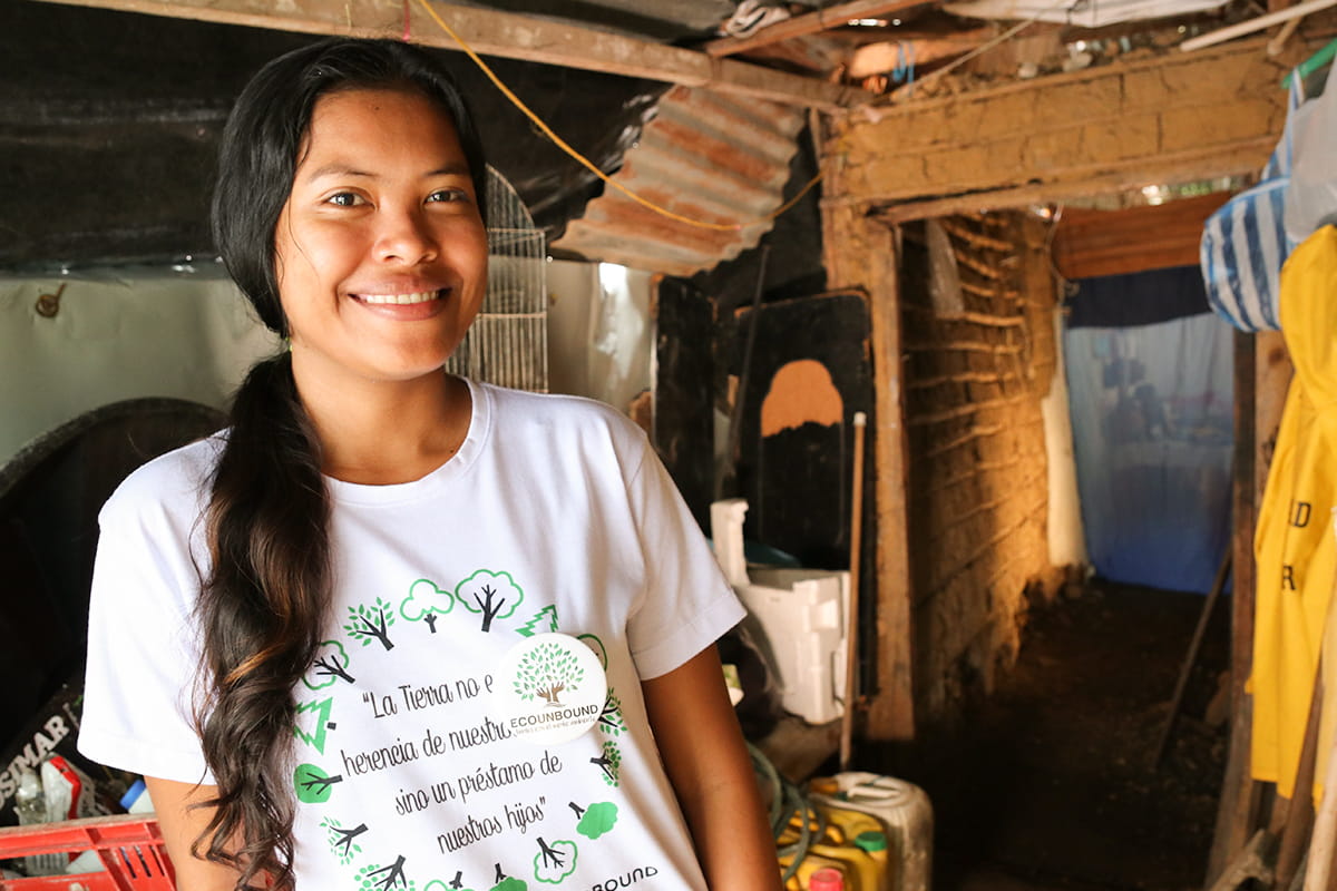 Photo 3: Maria Angelica, a sponsored university student from Colombia, is one of the leaders of EcoUnbound, a community conservation program. Her T-shirt features the proverb, “We do not inherit the Earth from our ancestors, we borrow it from our children.”