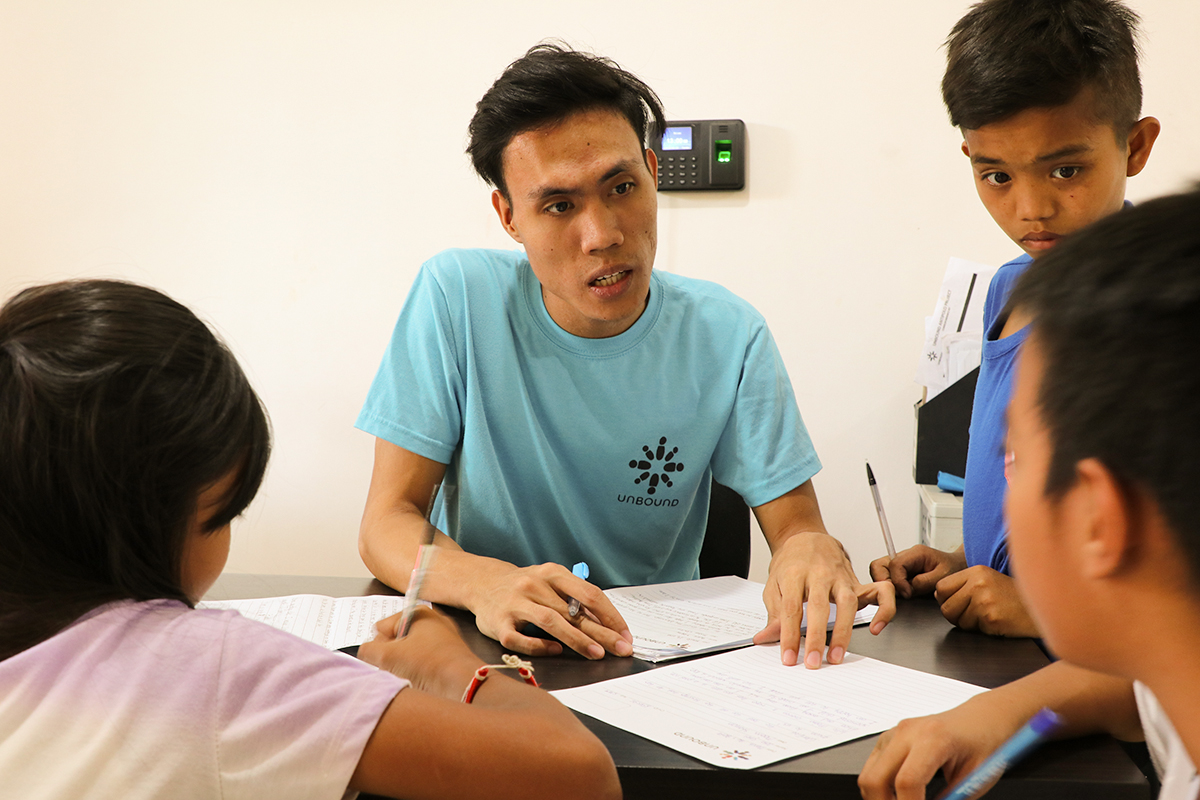 Photo 1: Jordan, center, is an Unbound scholarship student from the Philippines. He serves his local community by tutoring younger children. Here he helps (from left) Jachelle, Archie and John write letters to their sponsors in the U.S.