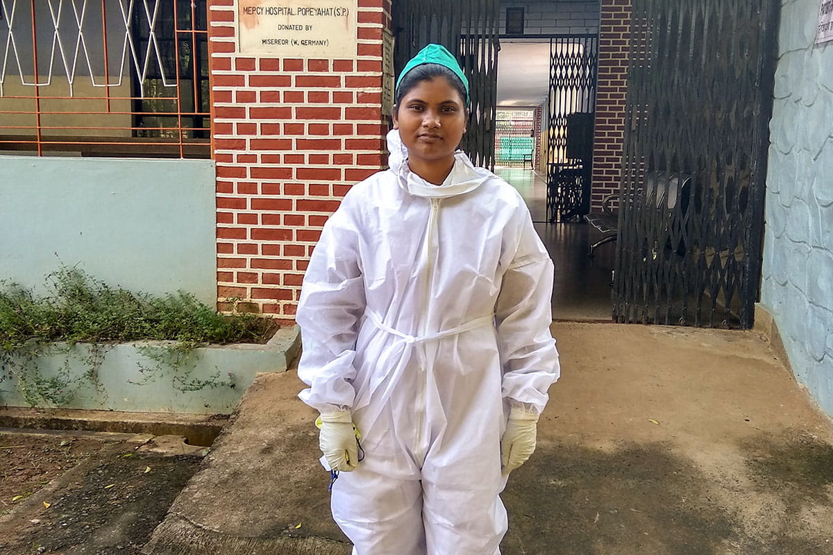 Photo 1: Pinky, a former sponsored child, stands outside the hospital in Bhagalpur, India, where she is doing her nursing internship. Health care workers in India were struggling to keep up with the demands of the COVID-19 crisis.