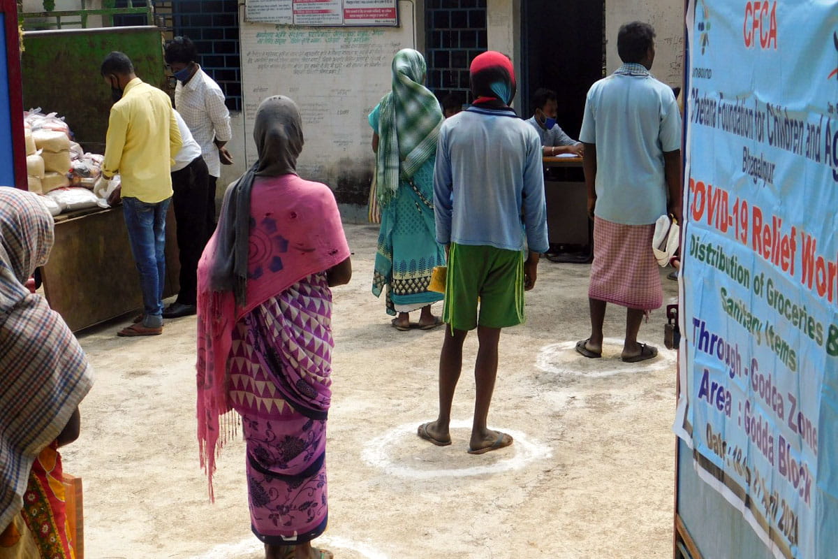 Photo 2: In June, India led the world in the rate of COVID infections and deaths. In Bhagalpur, India, members of families in the Unbound community observe proper physical distancing while waiting to receive supplies at a local program office.