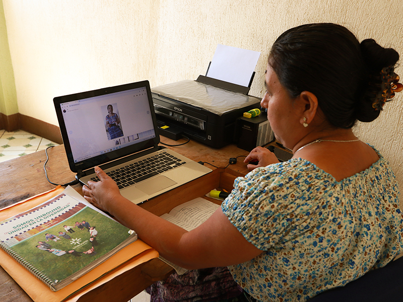 Photo 2: Unbound social worker Alicia Andrea Peneleu in Guatemala uses digital platforms to communicate with families she serves. She says about half of families have access to platforms like WhatsApp. For those without access, other community members play a critical role in keeping them connected.