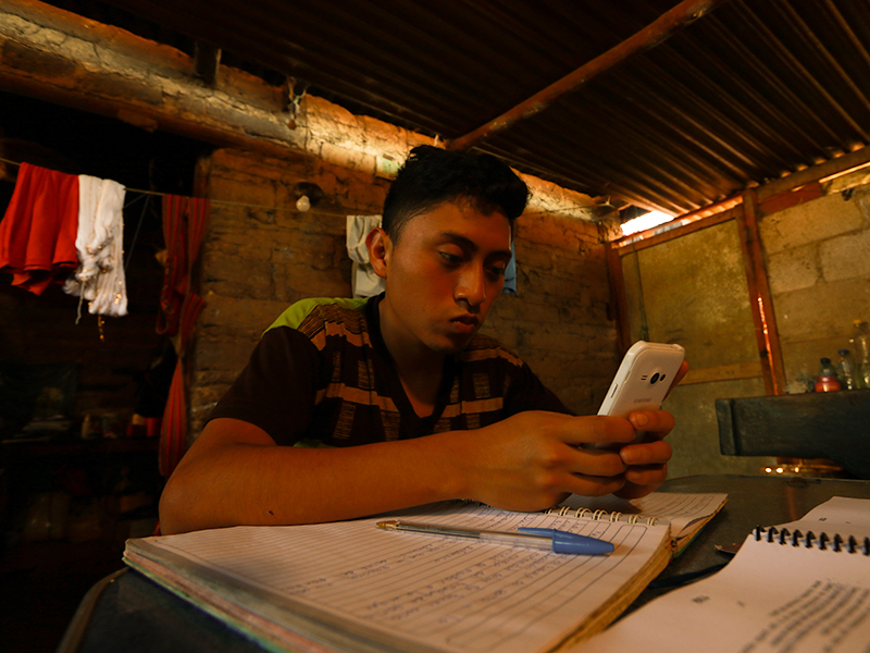 Photo 1: Nursing student and Unbound sponsored youth Pablo in Guatemala communicates with families served by Unbound in his community. When a child and family complete their letter for their sponsor, they take a picture of it and send it to Pablo, who forwards it to the Unbound social worker for their area. Pablo says being a link between families and the Unbound staff during the pandemic is one way he can help eradicate poverty.