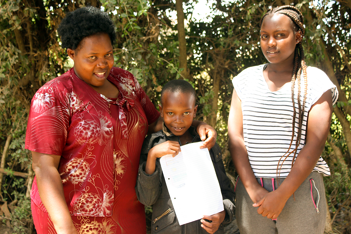 PHOTO 3: Sponsored child John, 10, from Kenya holds up a picture he drew for his sponsor in the U.S. Giving the shy lad moral support are his mother, Josephine (left) and sister Eunice (right.)