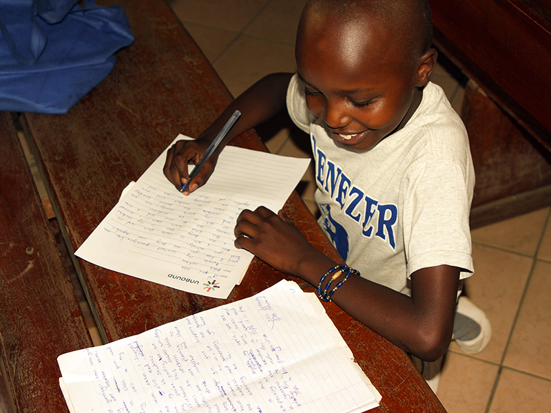 PHOTOS 1 & 2:  Sponsored children Sarah, 12, (left) and Peter, 11, (right), write letters to their Unbound sponsors. Letter writing is the primary way sponsors and their sponsored friends are able to get to know each other and stay in touch.