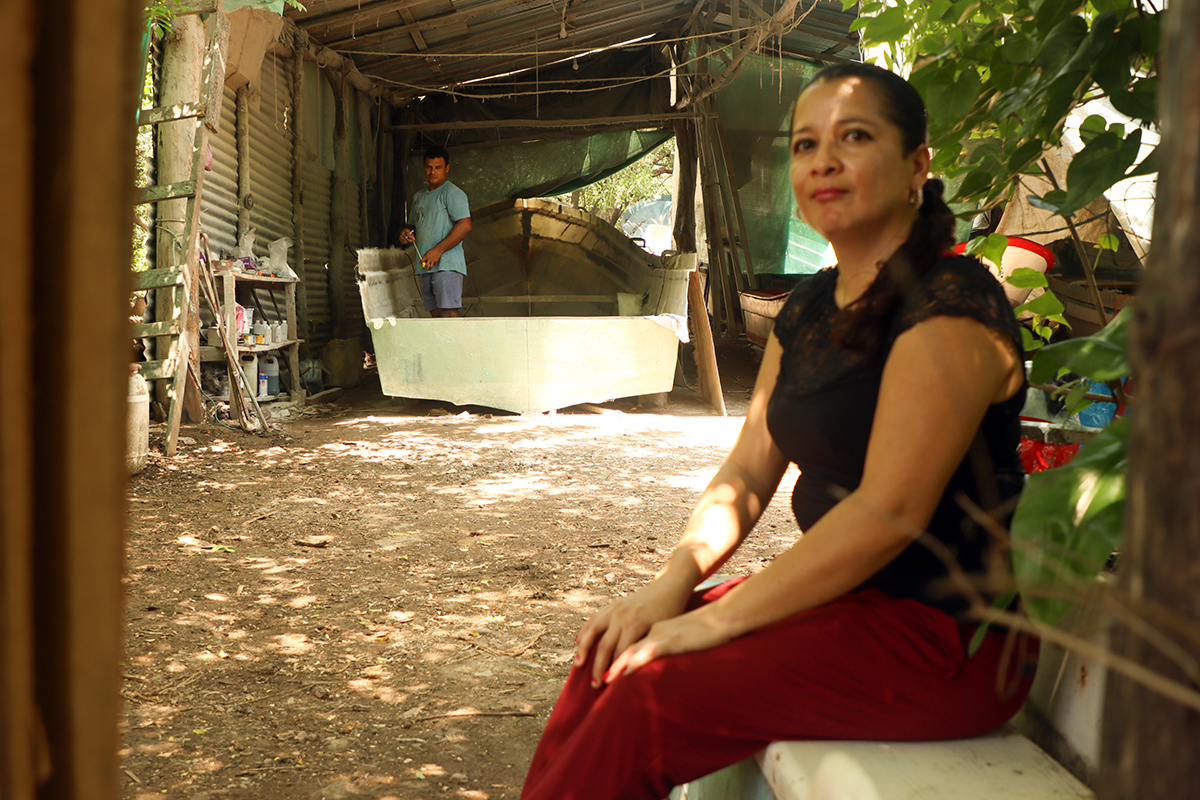 Photo 1: Darling, Rolando’s wife, sits in front of her husband’s new boat workshop in Costa Rica. Darling worked on banana plantations from the time she was 13 until she married. When she met Rolando at the age of 15, she thought he was “old fashioned,” but they have now been married for more than 20 years. Darling helps Rolando manage the business side of the family boatbuilding business and promotes his work on social media.