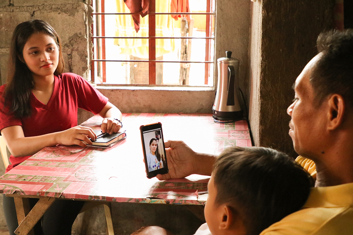 Photo 1: Sponsored youth Angela sits at the family table with her father, Rogelio, and brother Jacob, having a conversation via video chat with her mother, Susan, an Overseas Filipino Worker (OFW), in 2019. For almost 10 years, the family’s only daily connection to Susan as she worked as a nanny abroad was video chat or social media.