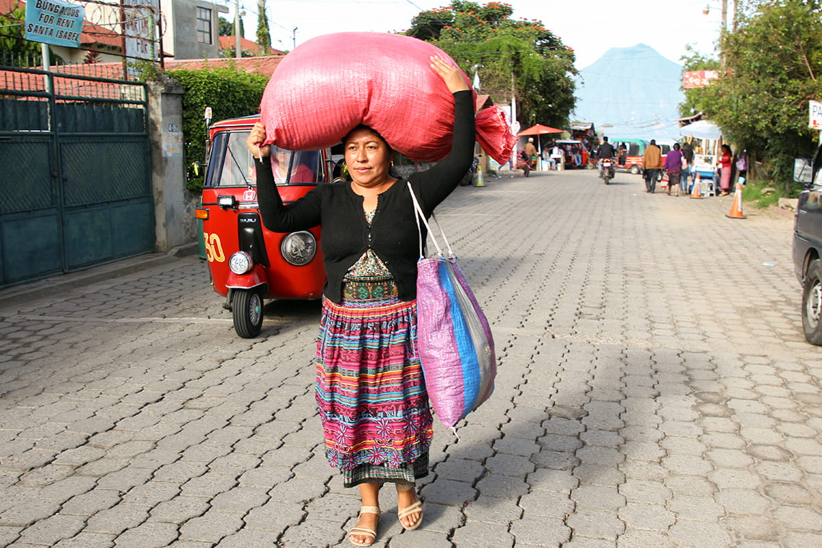 In photos from 2019, Sandra, the mother of sponsored child Christopher, carries a bundle of fabrics she wove. The family lives in a town on the shores of Lake Atitlan in southern Guatemala, but Sandra sells the fabrics in a town on the other side of the lake. Two days a week, she travels by ferryboat, on foot and by bus to get to the marketplace.