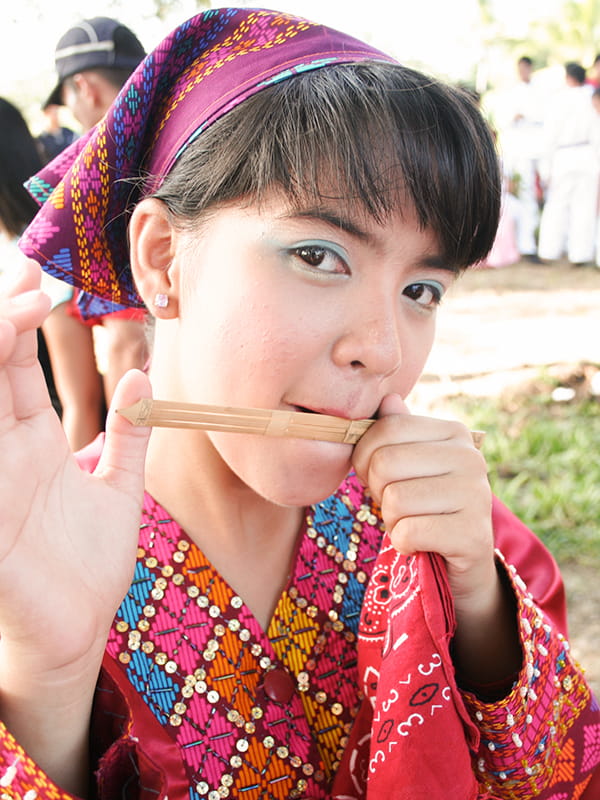 Photo 1: Backstage at the concert in January 2008, Xarina Acuña practices playing her ‘kubing,’ a Filipino mouth harp. She and the other Unbound youth would soon perform for the audience of 10,000.