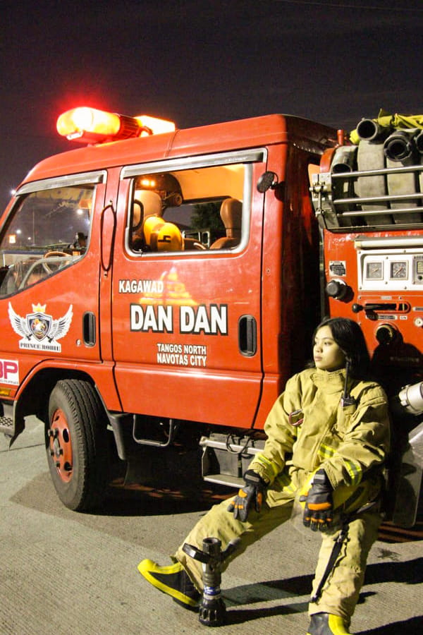 She puts on her uniform, helmet and gloves, which are all borrowed from the Bureau of Fire Protection (BFP). Her fire boots are the only piece of her attire she owns. She joins the rest of the firefighters, all men, at the Navotas Fire Station a few blocks from her home where she will ride on the fire truck to the scene of the fire.