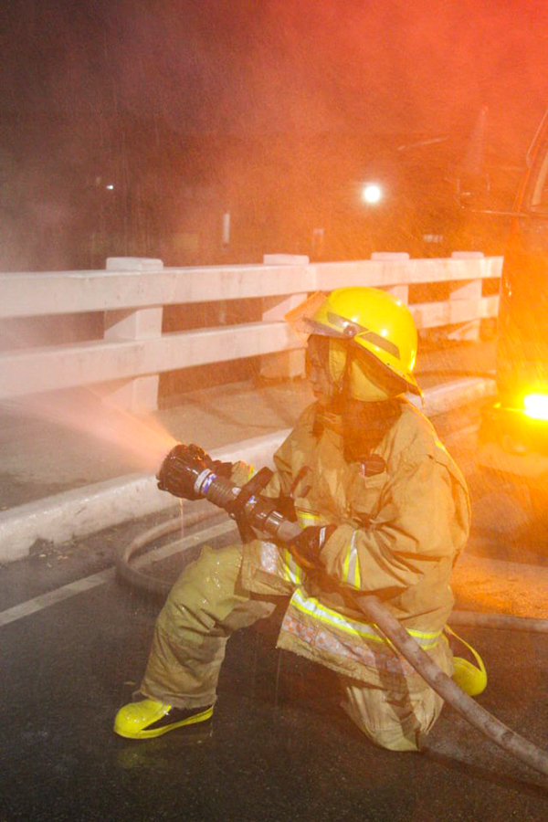 There, Cleo and another firefighter hold the water hose to fight the fire, a responsibility sometimes far more dangerous than entering the fire itself due to the high-powered water pressure of the hose.