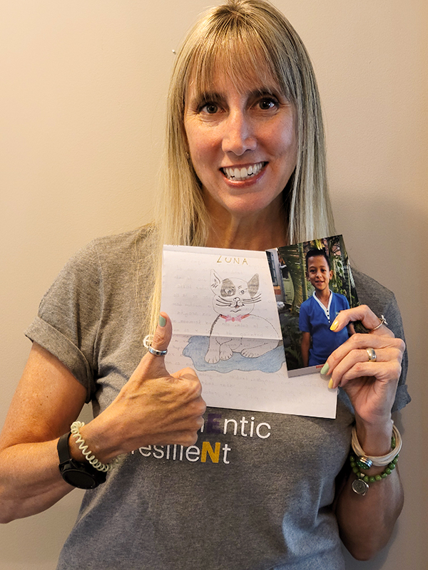Photo 1: Sponsor Rachael Wohletz holds a letter and photo from her sponsored friend Jhon. Rachael began sponsoring Jhon when he was 6 and too young to write, so she corresponded with his mother. Now, Rachael enjoys hearing from Jhon and receiving drawings, like this one of his cat, Luna.